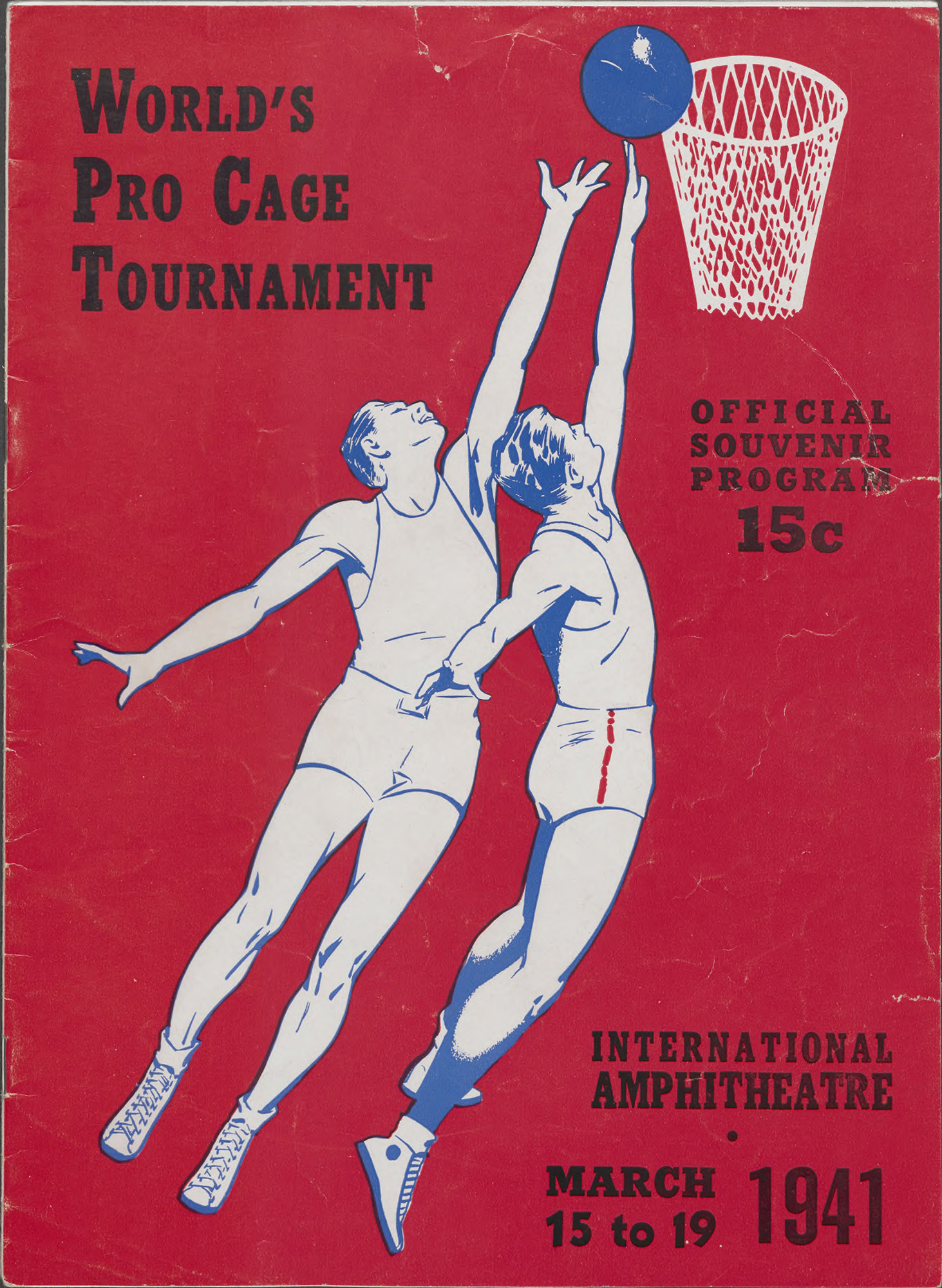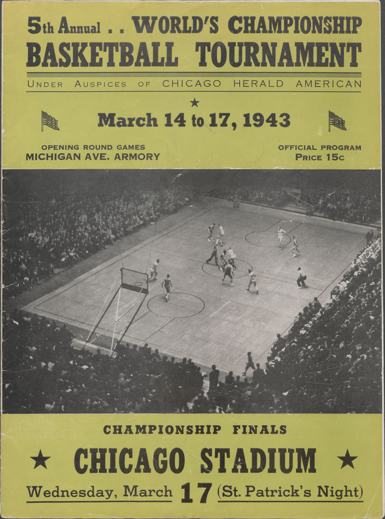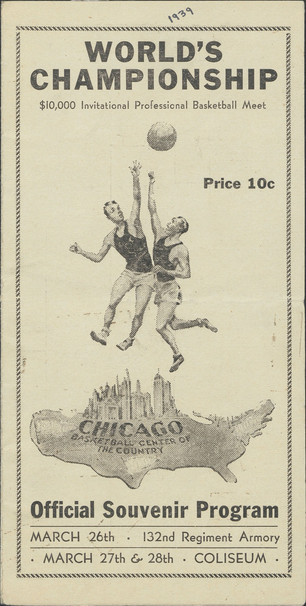 More ... 1939: World's Championship $10,000 Invitational Professional Basketball Meet, official souvenir program. The inaugural tournament, held March 26 to 28, was won by the New York Rens, an independent African American basketball team based in Harlem. They defeated the Oshkosh All-Stars of the National Basketball League (NBL) in the title game at Chicago Coliseum, 34-25. Twelve teams were invited and preliminary games were staged at the 132nd Regiment Armory. The other participating squads were the House of David All Stars, Chicago Harmons, Clarksburg Oilers, Fort Wayne Harvesters, Harlem Globe Trotters, Illinois Grads, Kate Smith’s New York Celtics, New York Yankees, and Sheboygan Redskins. The Rens defeated Fort Wayne, the New York Yankees, and the Globetrotters to reach the final. Clarence “Puggy” Bell of the Rens was named the tournament’s Most Valuable Player. Bell and his teammate Zack Clayton were named to the All-Tournament Team along with Globetrotters star Babe Pressley. The program cost 10¢ and the total prize was $10,000.