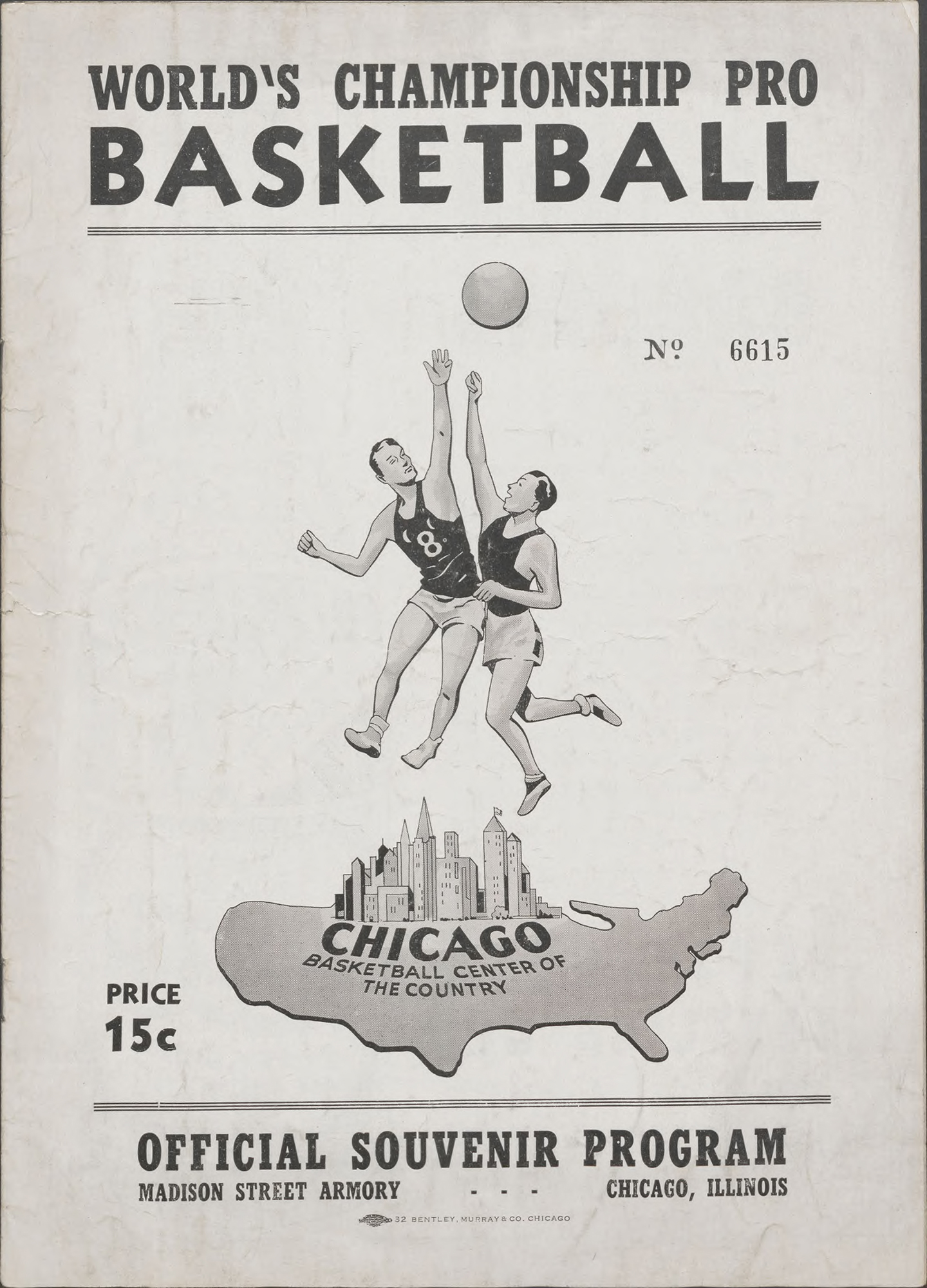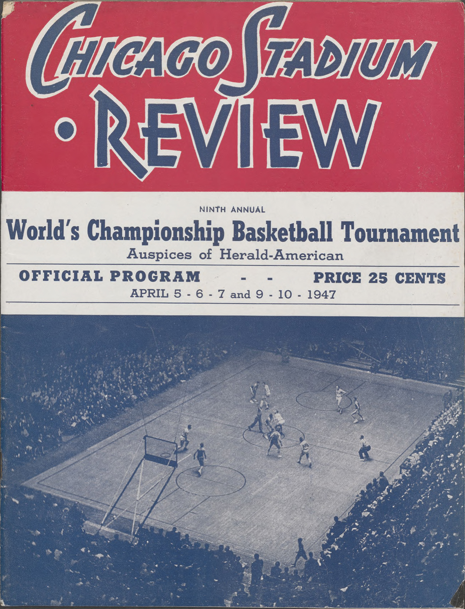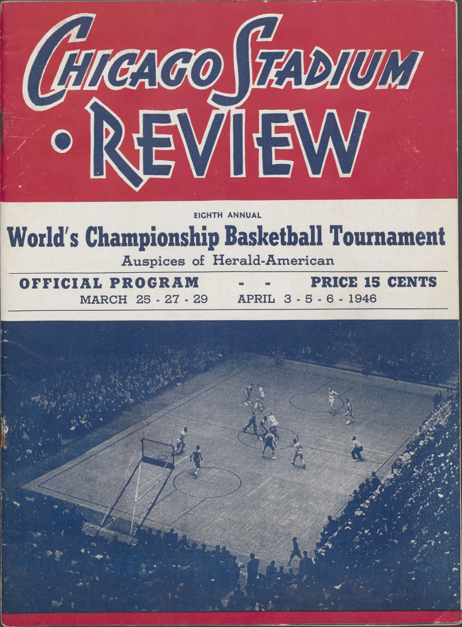 More ... 1939: World's Championship $10,000 Invitational Professional Basketball Meet, official souvenir program. The inaugural tournament, held March 26 to 28, was won by the New York Rens, an independent African American basketball team based in Harlem. They defeated the Oshkosh All-Stars of the National Basketball League (NBL) in the title game at Chicago Coliseum, 34-25. Twelve teams were invited and preliminary games were staged at the 132nd Regiment Armory. The other participating squads were the House of David All Stars, Chicago Harmons, Clarksburg Oilers, Fort Wayne Harvesters, Harlem Globe Trotters, Illinois Grads, Kate Smith’s New York Celtics, New York Yankees, and Sheboygan Redskins. The Rens defeated Fort Wayne, the New York Yankees, and the Globetrotters to reach the final. Clarence “Puggy” Bell of the Rens was named the tournament’s Most Valuable Player. Bell and his teammate Zack Clayton were named to the All-Tournament Team along with Globetrotters star Babe Pressley. The program cost 10¢ and the total prize was $10,000.