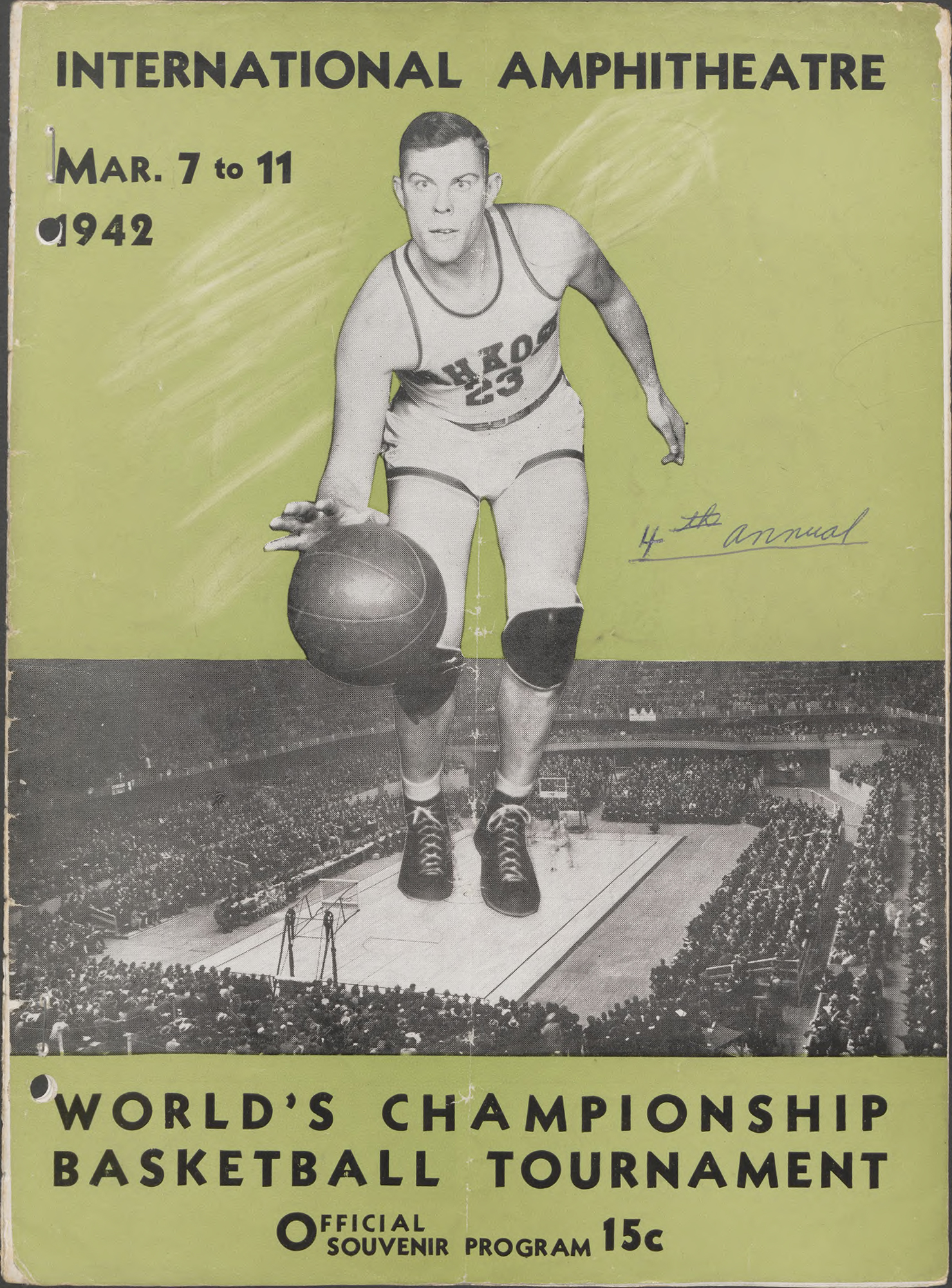 More ... 1942 World's Championship Basketball Tournament official souvenir program. The fourth annual tournament, held March 7 to 11, saw a rematch between the Oshkosh All-Stars (NBL) and the independent Detroit Eagles, at the same Chicago International Amphitheatre venue as in 1941 but with the All-Stars winning the title this time, 43-41. The event comprised sixteen teams, with several new entrants. The other squads were the U.S. Army Aberdeen Ordinance Training Center, Chicago Bruins, Columbus Bobb Chevrolets, Davenport Rockets, Detroit AAA, Fort Wayne Zollner Pistons, Hagerstown Conoco Oilers, Harlem Globetrotters, Indianapolis Kautskys, Long Island Grumman Flying V’s, Northern Indiana Steelers, New York Rens, Sheboygan Red Skins, and Toledo Jim White Chevvies. In addition to the Black players on the Rens and on the Globetrotters, there were again two African Americans with Toledo (William “Billy” Jones and Jimmy Johnson), which was the same squad as the previous year’s White Huts team, renamed. There were also two African American players with the Grumman team: future Long Island University Sports Hall of Fame member William “Dolly” King and future Basketball Hall of Fame member William “Pop” Gates. The New York Rens featured future Basketball Hall of Fame members Sonny Boswell, Zack Clayton, and John Isaacs. Boswell of the Rens, Bernie Price of the Globetrotters, and Dolly King of the Flyers each made the All-Tournament Team. This souvenir program cost 15¢ and the total prize money was $15,000.