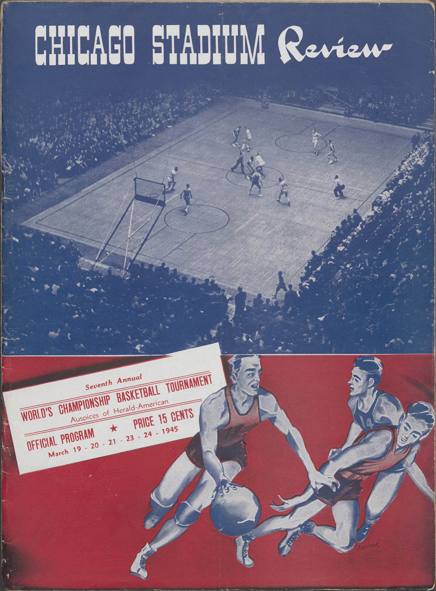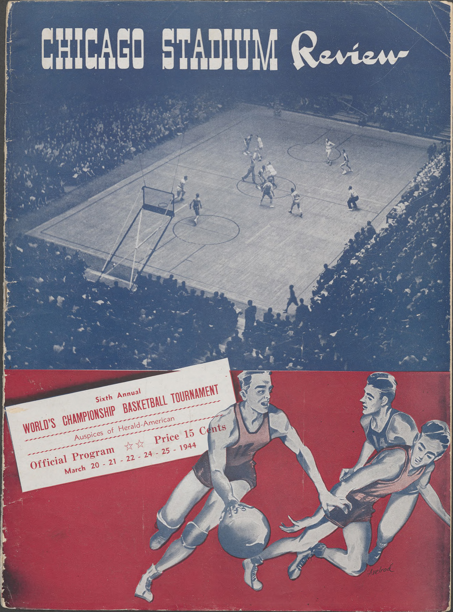 More ... 1943: 5th Annual World's Championship Basketball Tournament official souvenir program. In the 5th annual tournament, held March 14 to 17, the Washington Bears, an independent African American team, won the championship title by defeating the Oshkosh All-Stars (NBL) at Chicago Stadium, 43-31. Every player on the Bears had previously played for the New York Rens. Opening round games were played at the Michigan Avenue Armory. The other participating teams were the Akron Collegians, Chicago Ramblers, Dayton Dive Bombers, Detroit Eagles, Fort Wayne Zollner Pistons, Harlem Globetrotters, Indianapolis Pure Oils, Minnesota Rock Spring Sparklers, Sheboygan Red Skins, and the Chicago Studebakers. This was the most racially diverse tournament yet. In addition to the African American rosters of the Bears and the Globetrotters, the Chicago Studebakers featured seven Black players in their lineup including future Basketball Hall of Fame member Wyatt “Sonny” Boswell. In addition, the Indianapolis Pure Oils squad included one African American player, future Indiana Basketball Hall of Fame member George Crowe, who had been Indiana’s first Mr. Basketball in 1939. The Bears got a first-round bye and then defeated Rock Spring and Dayton to reach the final. Bears players William “Pop” Gates and William “Dolly” King were named to the All-Tournament First Team, while Zack Clayton was named to the All-Tournament Second Team. The Globetrotters featured future Basketball Hall of Fame members Reece “Goose” Tatum in his first tournament appearance, as well as Nat “Sweetwater” Clifton, while the Bears roster had future Basketball Hall of Fame members Charles “Tarzan” Cooper, William “Pop” Gates, John Isaacs, and Zack Clayton. Box seats were $2.50, mezzanine tickets were $1.75, and first-balcony seating was $1.25. The price of the official souvenir program was 15¢ and the total tournament prize money was $15,000.