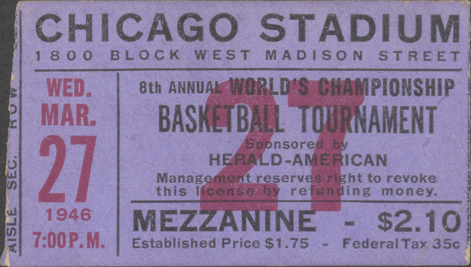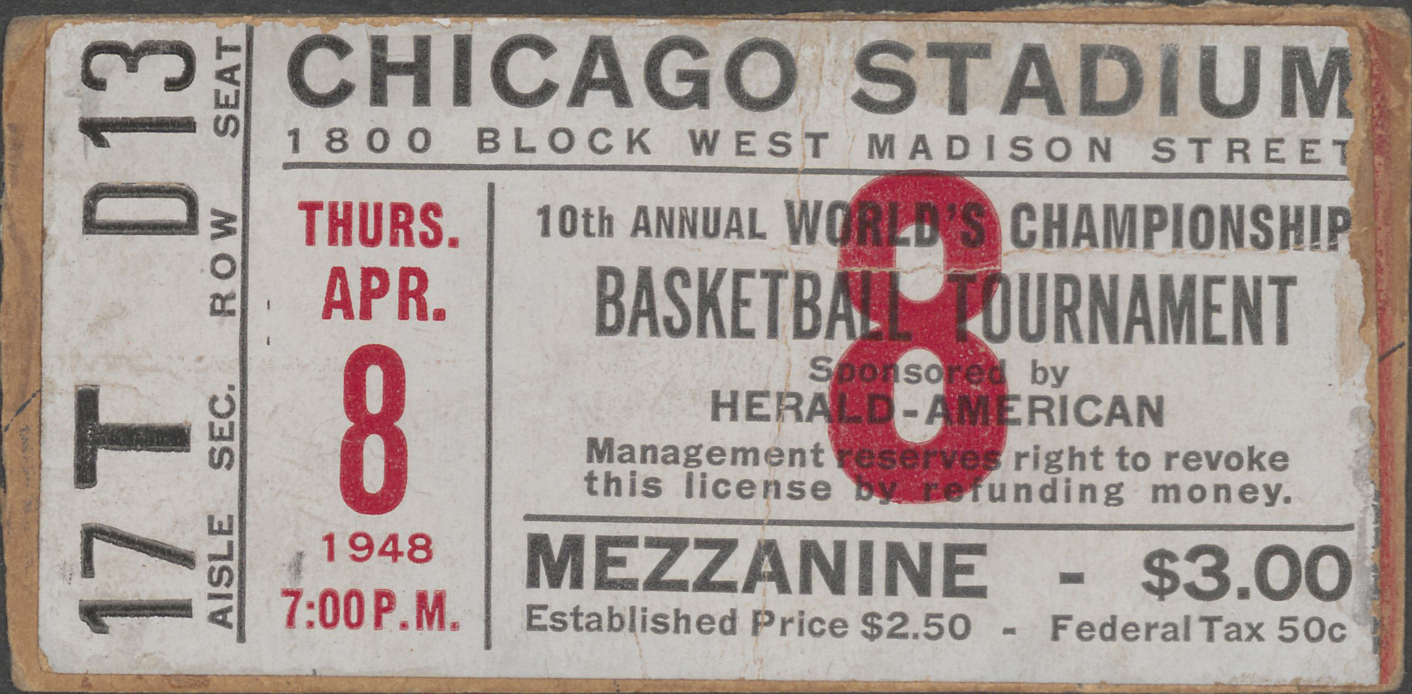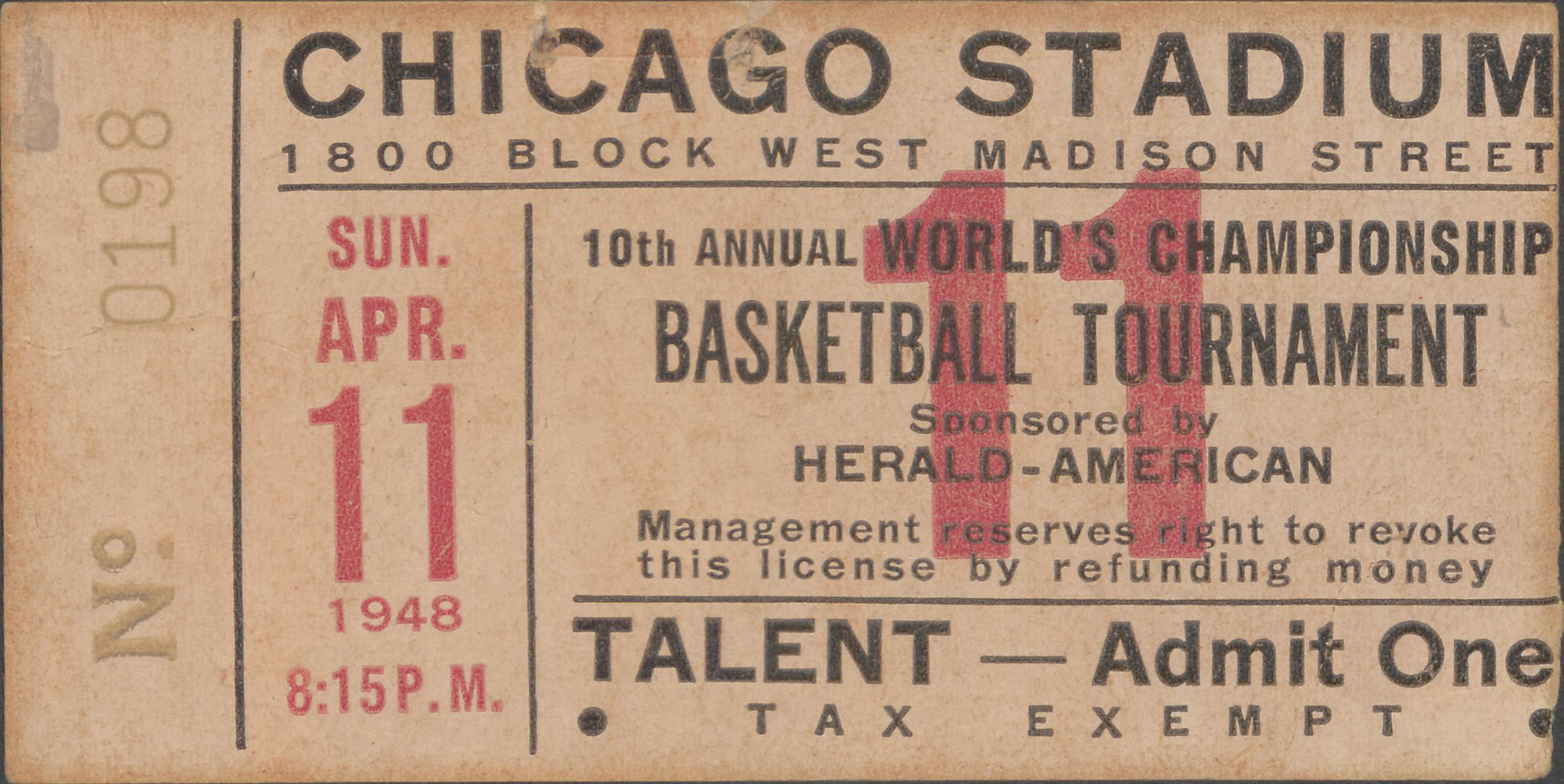 More ... A ticket stub used for admittance by "TALENT" to the 10th Annual World's Championship Basketball Tournament in 1948, held at Chicago Stadium. This was for admittance to the championship final game between the Minneapolis Lakers and the New York Rens as well as the consolation game.