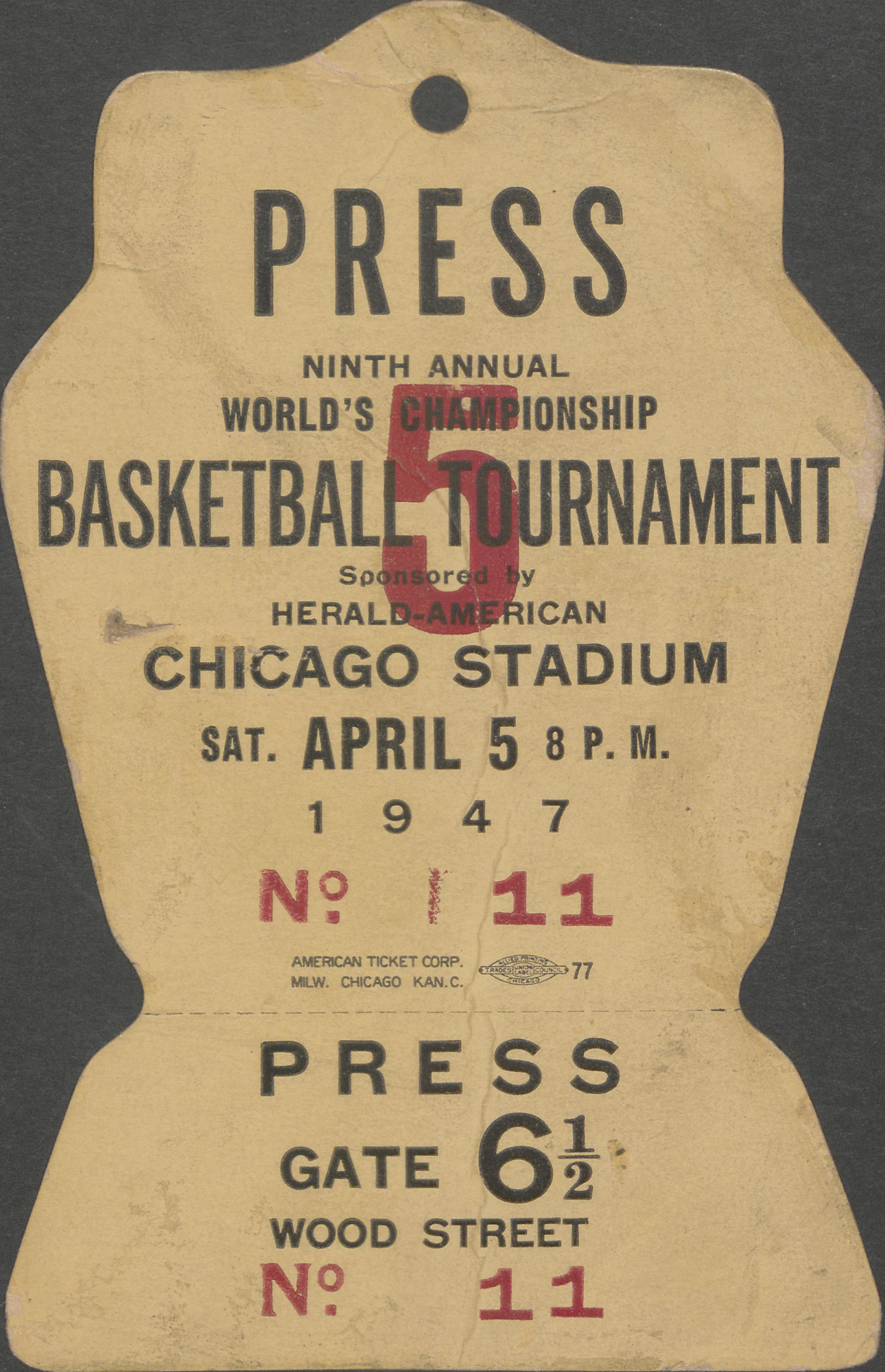 More ... A press pass for the 9th Annual World's Championship Basketball Tournament in 1947, held at Chicago Stadium. Made from card stock, this could be worn tucked into the hat band of a gentleman's hat or with a lanyard string.