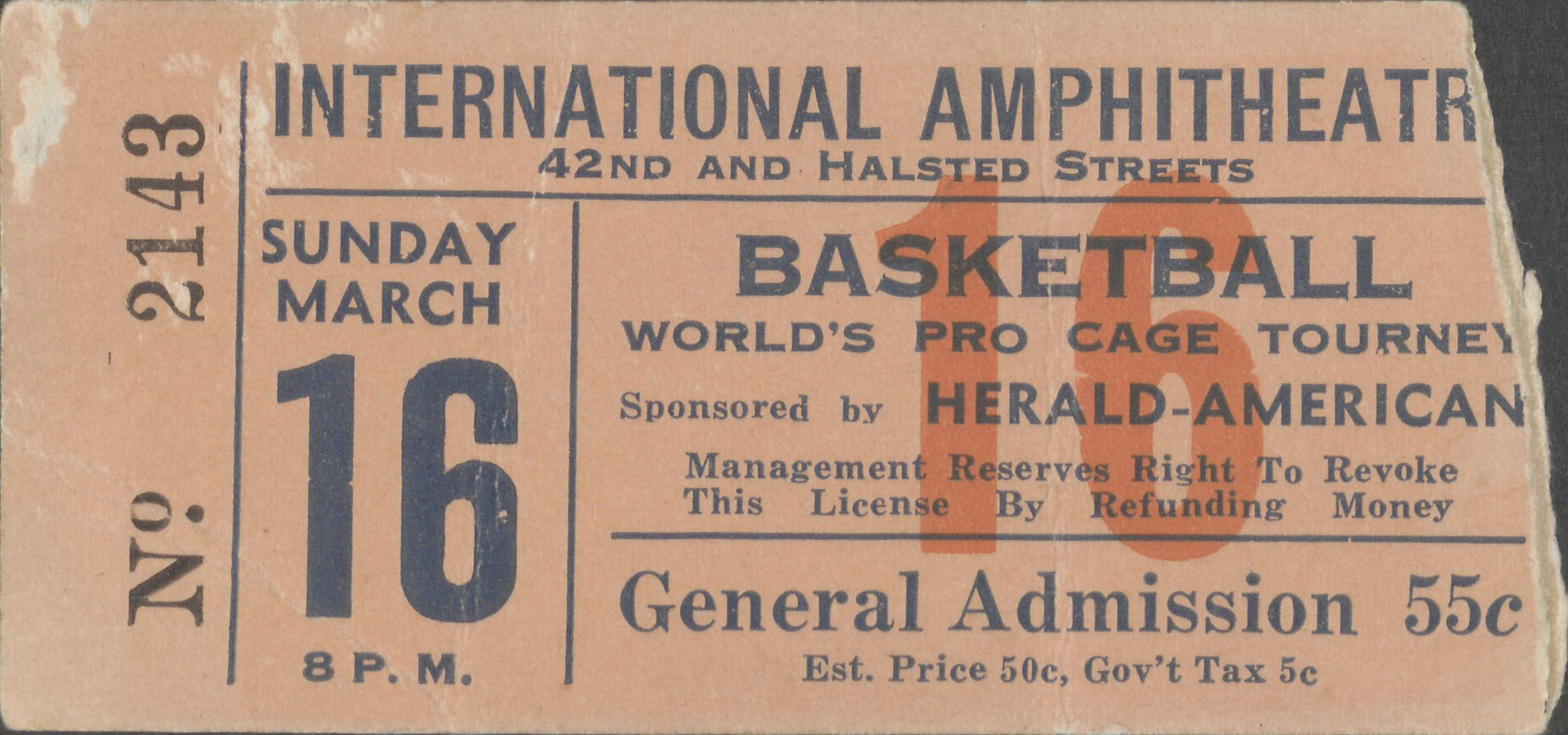 More ... A ticket stub for general admission to the "Basketball World's Pro Cage Tourney" in 1947, held at the International Amphitheatre in Chicago.