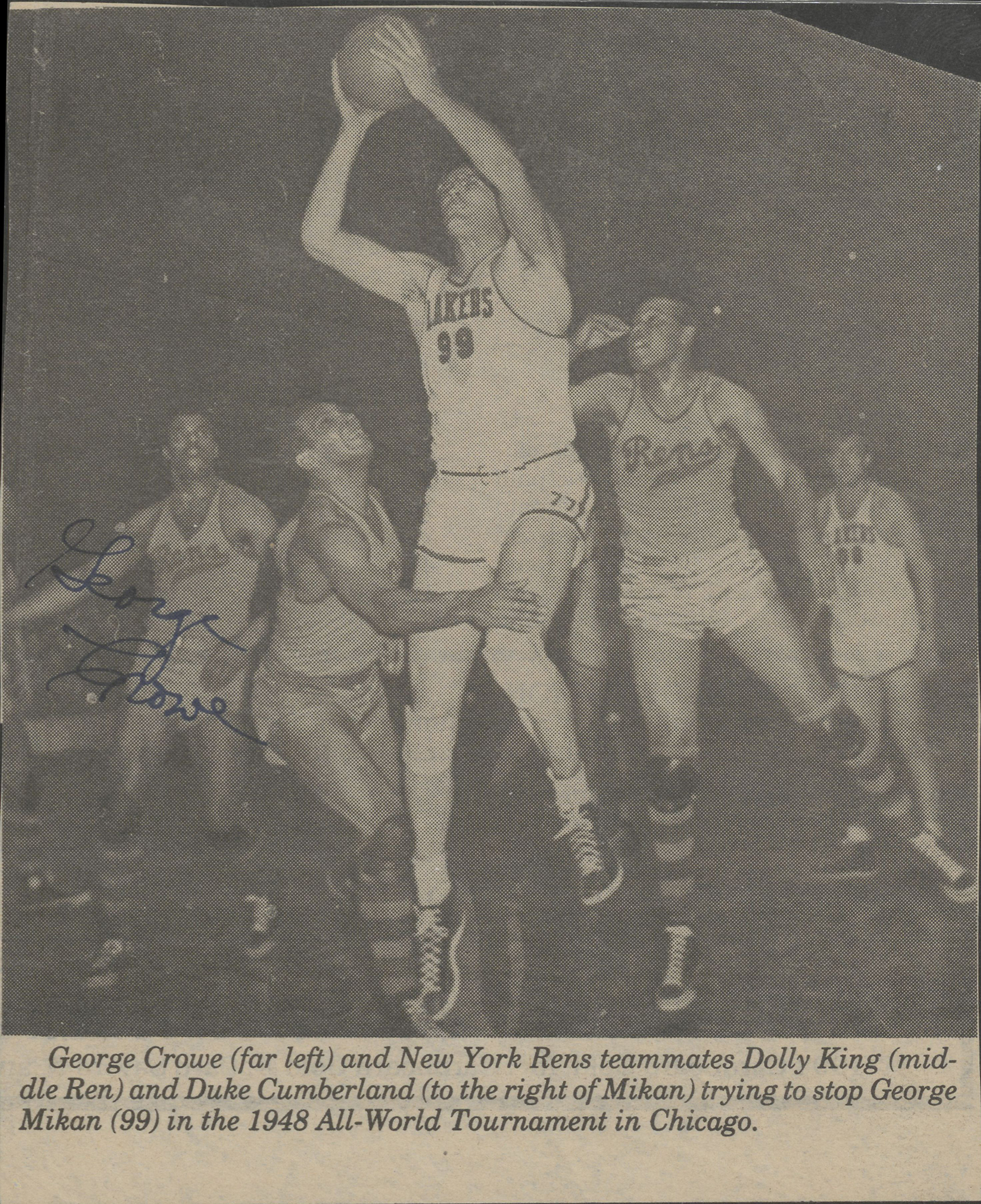 More ... A newspaper clipping showing game action between the New York Rens and the Minneapolis Lakers at the 1948 All-World Tournament in Chicago. Pictured in the image are George Mikan, Dolly King, George Crowe, and Duke Cumberland. Autographed by Rens player George Crowe.