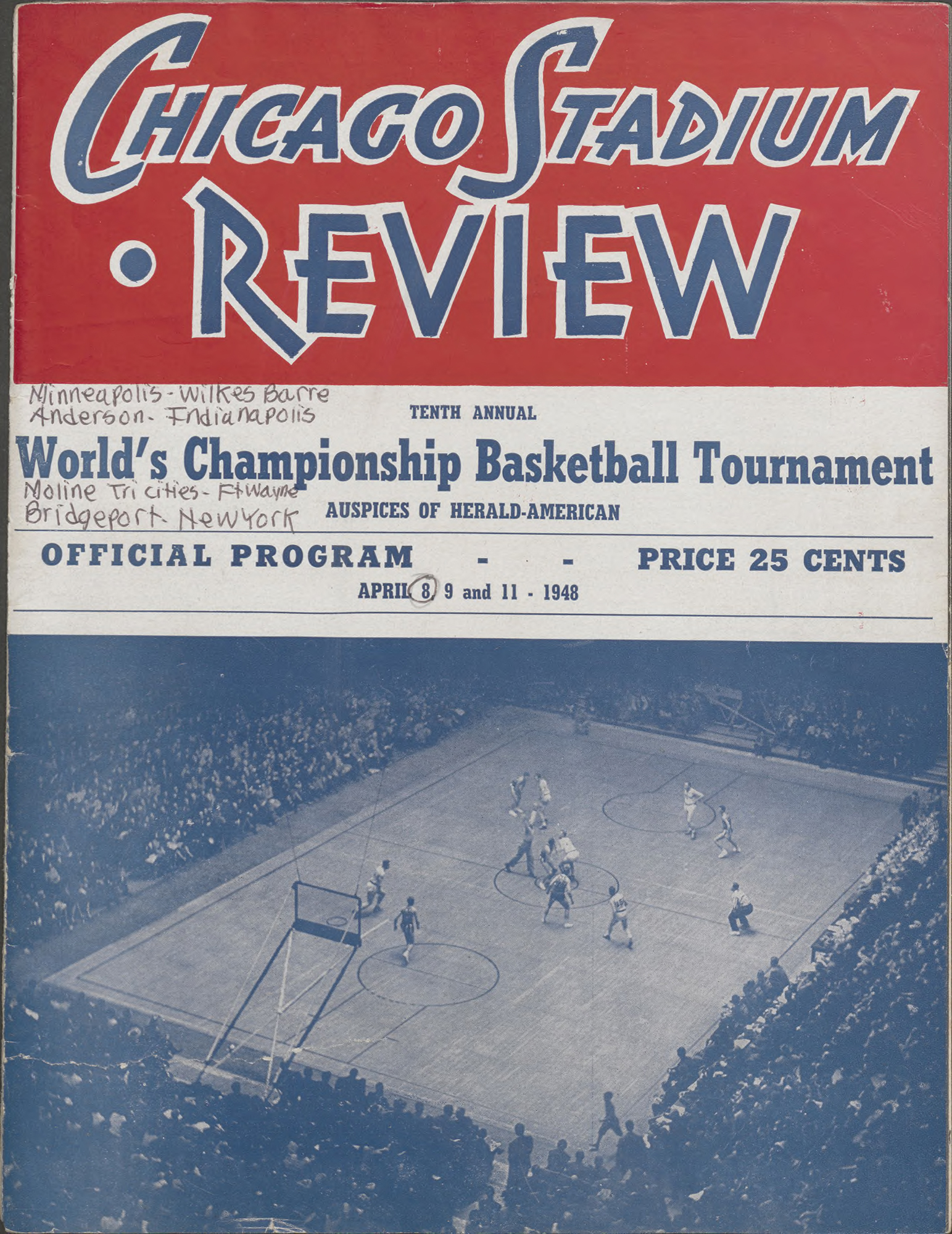 More ... 1948: Tenth Annual World's Championship Basketball Tournament official souvenir program. In the 10th and final tournament, held April 8, 9, and 11, the Minneapolis Lakers (NBL) won their first tournament championship by defeating the independent New York Rens in the title game at Chicago Stadium, 75-71. The other participating teams were the Anderson Duffy Packers, Bridgeport Newfields, Fort Wayne Zollners, Indianapolis Kautskys, Moline Tri-Cities Blackhawks, and Wilkes-Barre Barons. The Rens were the only all-Black team in the tournament. The only other squad with African American players on its roster was the Bridgeport Newfields, with John Wilson and Ernie Gomez, both natives of Harlem. The Rens featured future Indiana Basketball Hall of Fame member George Crowe and future Atlantic City mayor Jim Usry as well as future Basketball Hall of Fame member William “Pop” Gates, future Long Island University Sports Hall of Fame member William “Dolly” King, and future NBA player Nathaniel “Sweetwater” Clifton. Clifton played a controversial role in the title game between his Rens squad and the National Basketball League champion Minneapolis Lakers, with future Hall of Fame member George Mikan, after which some teammates stated that he “threw the game.” His dramatic late-game uncharacteristic turnover (with a behind-the-back pass during a three-on-one fast break) squandered a chance for the Rens to tie the game. Instead, the Lakers’ final possession with seconds left in the game resulted in a basket and the four-point lead that was their winning margin. The final score was Lakers 75, Rens 71. This souvenir program cost 15¢ and the total tournament prize money was $15,000.