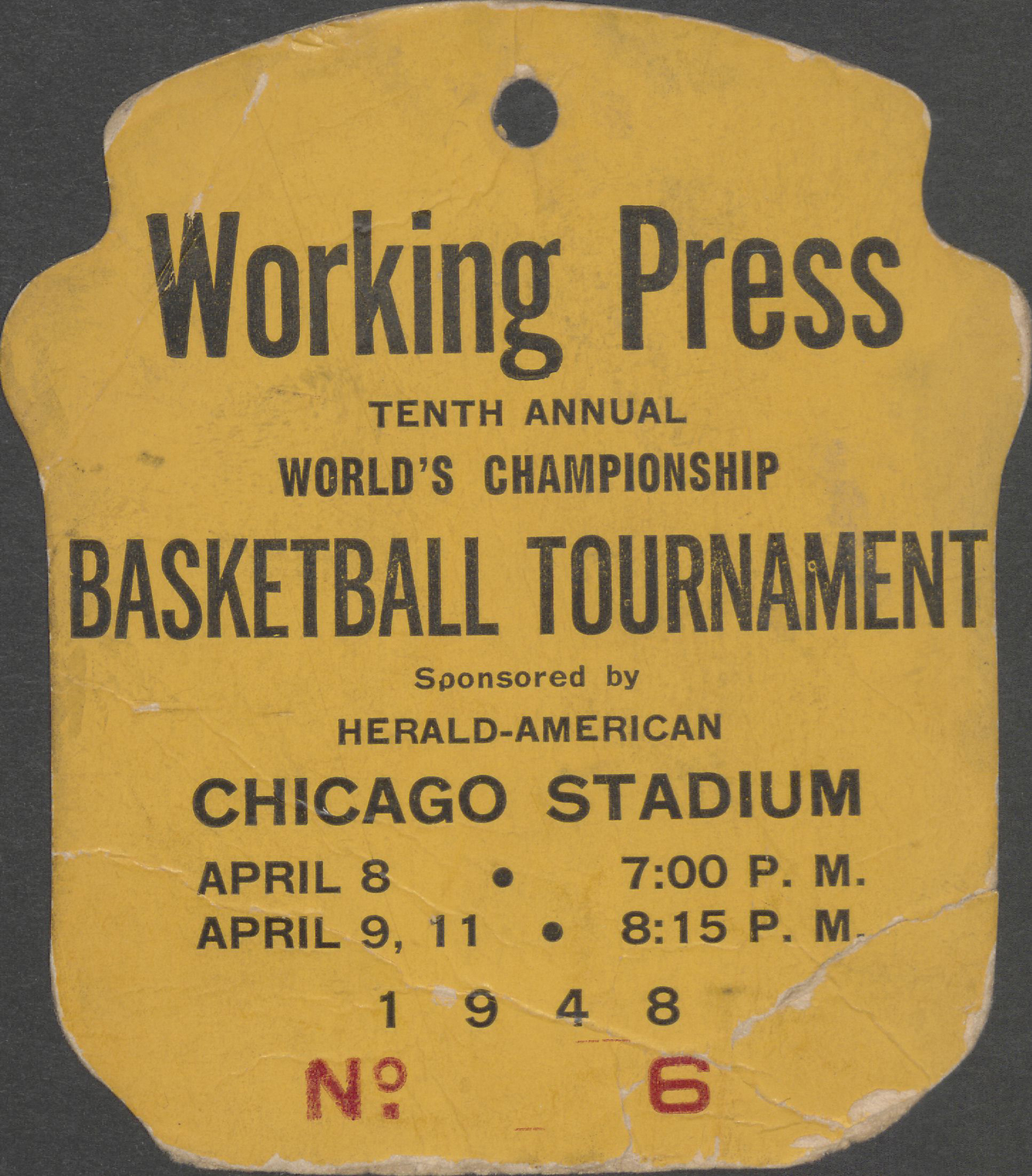 More ... A working press pass for the 10th Annual World's Championship Basketball Tournament in 1948, held at Chicago Stadium.